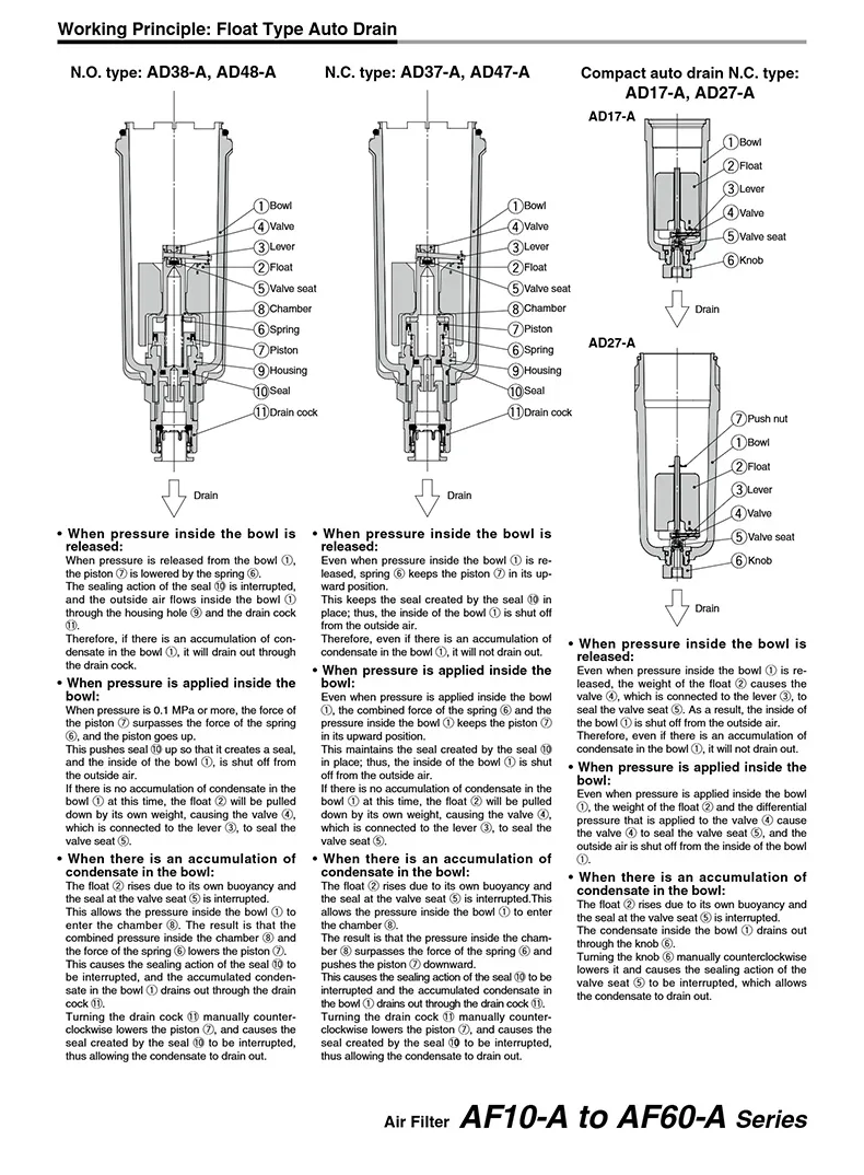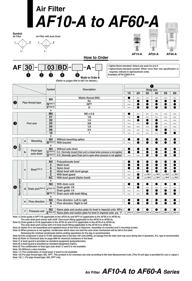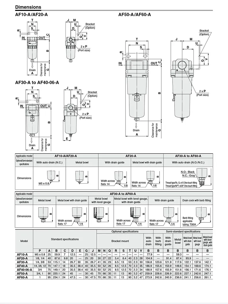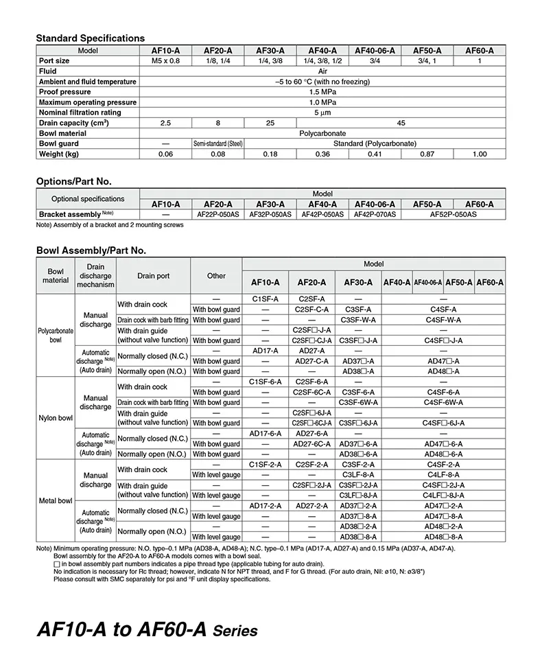 SMC type AF series air filter various filter elements are available• Precision thread • High-quality seal •High strength material • Long lifespanClear thread without burrDouble layer polycarbonate bowl 360°visual confirmationHigh efficiency filtration is stable and durable