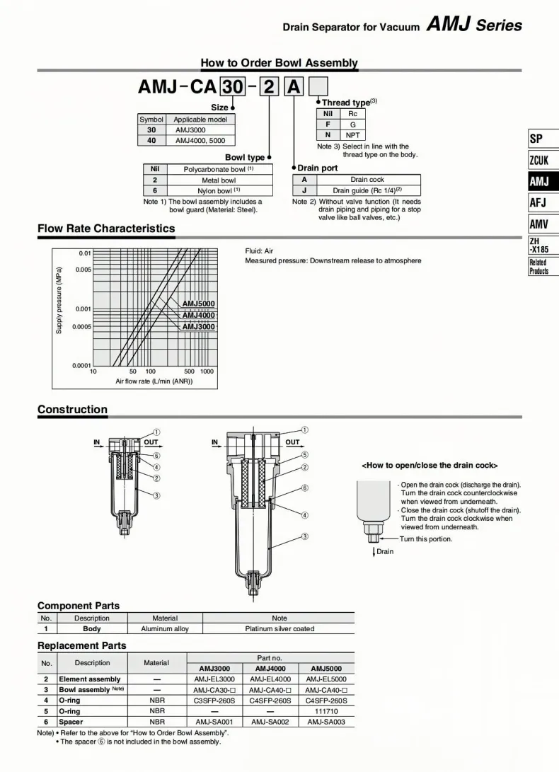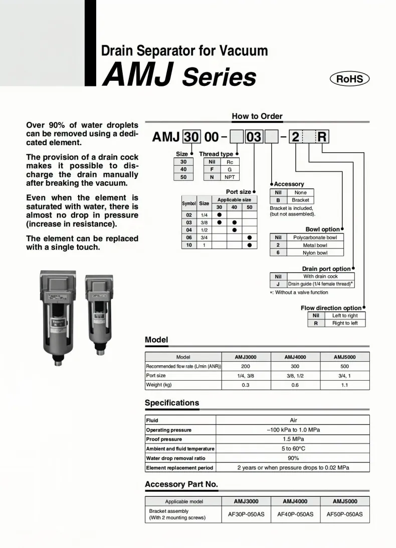 Drain Separator for Vacuum AMJ SeriesHigh-efficiency water removal. Can remove over 90% of water droplets.Aluminum alloy material. Compact structure, resistant to impact. Surface is treated with paint for corrosion resistance. Suitable for various scenarios.Even if the vacuum breakage is caused by the condensate valve, the condensate can still be discharged manually.