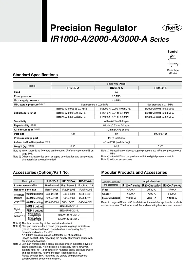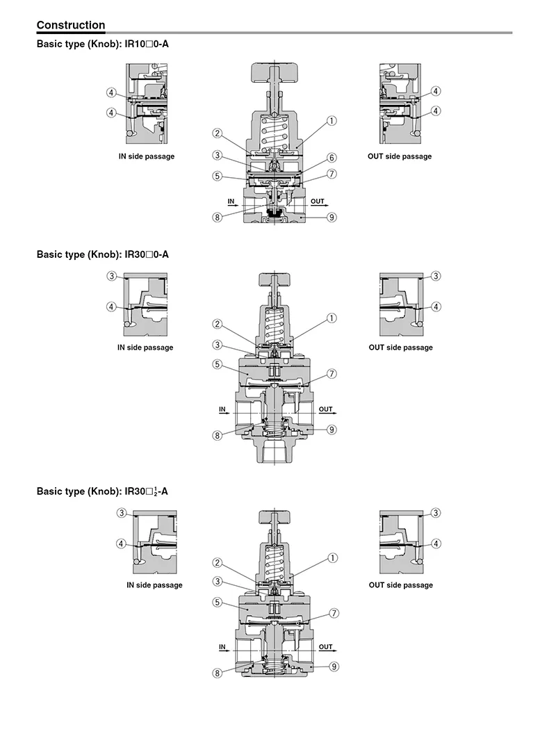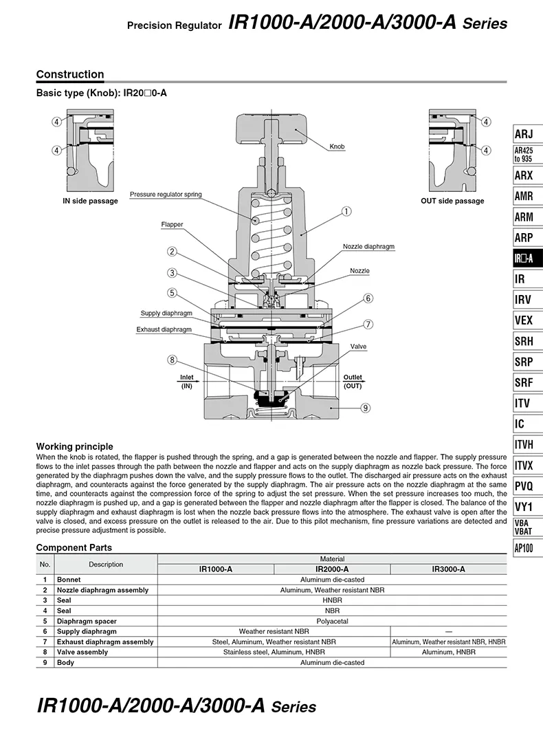 IR series precision pressure regulator with stable performanceTurning the knob clockwise is pressurization. Turning the knob counterclockwise is decompressionCompact structure with large flow strong sealing performance, prevent air leakageThe appearance is fine and smooth, no burrs, high hardness and good quality