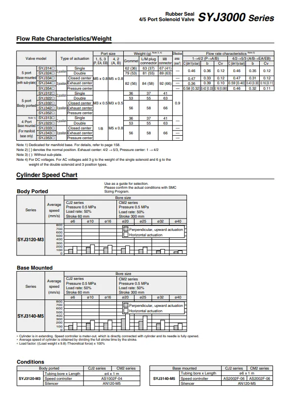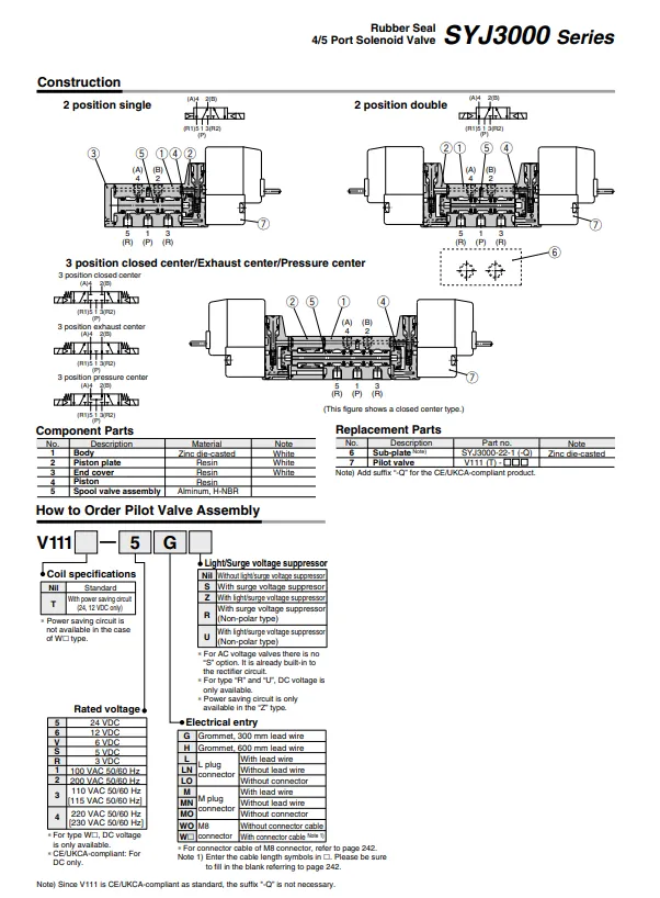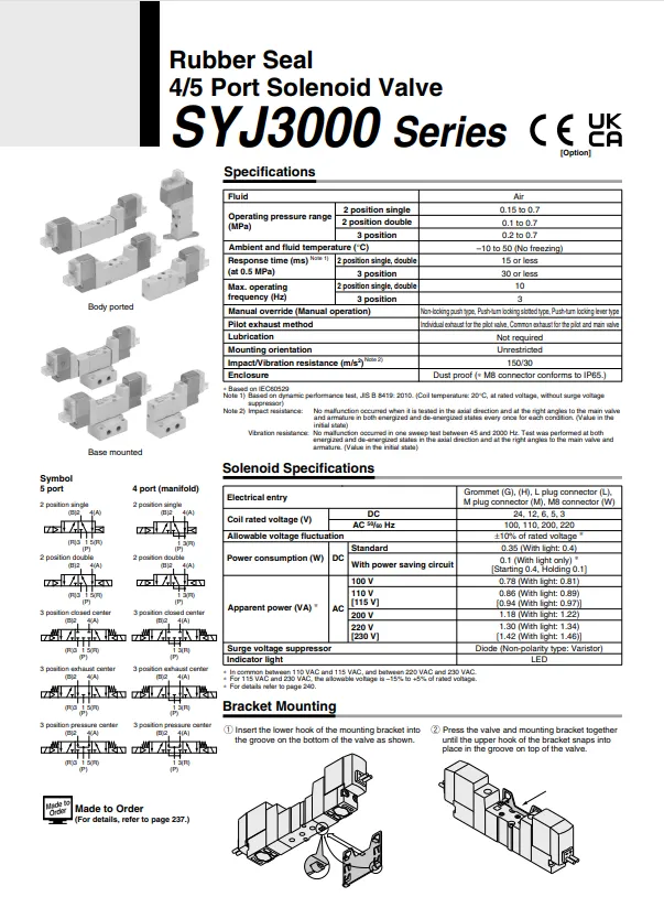 4/5 Port Solenoid Valve SYJ3000 SeriesSYJ Series Pilot-Type Solenoid Valve : High Efficiency, Energy Saving / Superior Quality/ Complete SpecificationsMulti-layered design, meticulously crafted. All core components are selected and equipped according to high standards. Long service life.With the manifold plate, the product offers specifications ranging from 2 digits to 20 digits, which can meet the demand of most working scenarios. The inclusion of blind plates can prevent unnecessary cost waste caused by changes in digit quantityHigh-precision valve core: Made of aluminum material. This material is suitable for the valve core as it has the property of withstanding high and low temperatures, reducing friction and improving the performance, stability and smoothness of the product, effectively extending the service life of the solenoid valve.