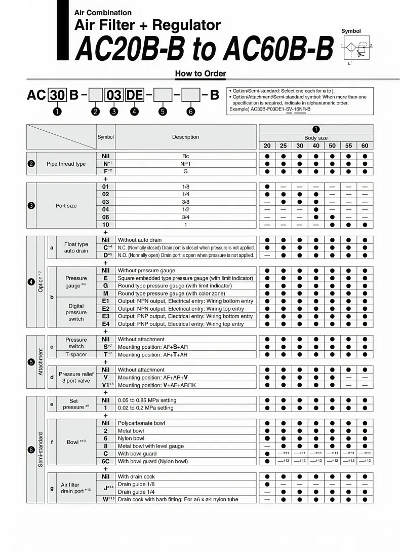 AC series air combination Air Filter+RegulatorComponent Function Introduction:The AF series air filters remove impurities, oil, sewage, etc. from the compressed air, and store them in the filter to achieve the purpose of making the compressed air dry and clean.The AR Series air relief regulator is used to adjust the pressure of compressed air. After adjusting to the appropriate pressure, the locking device should be locked to prevent accidental operation.The top of the product is marked with an arrow indicating the intake direction: IN: Intake port, OUT: Exhaust port. Note: Do not reverse the intake direction during installation, as it will cause excessive air leakage at the handle.