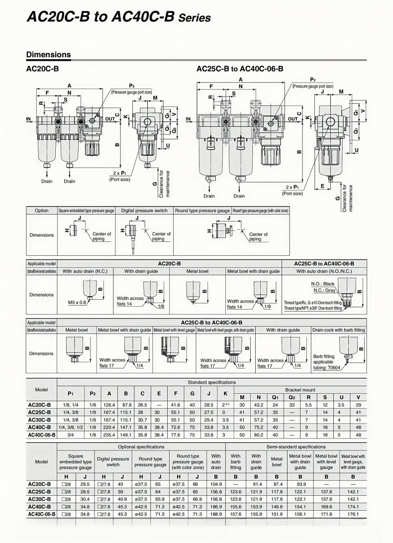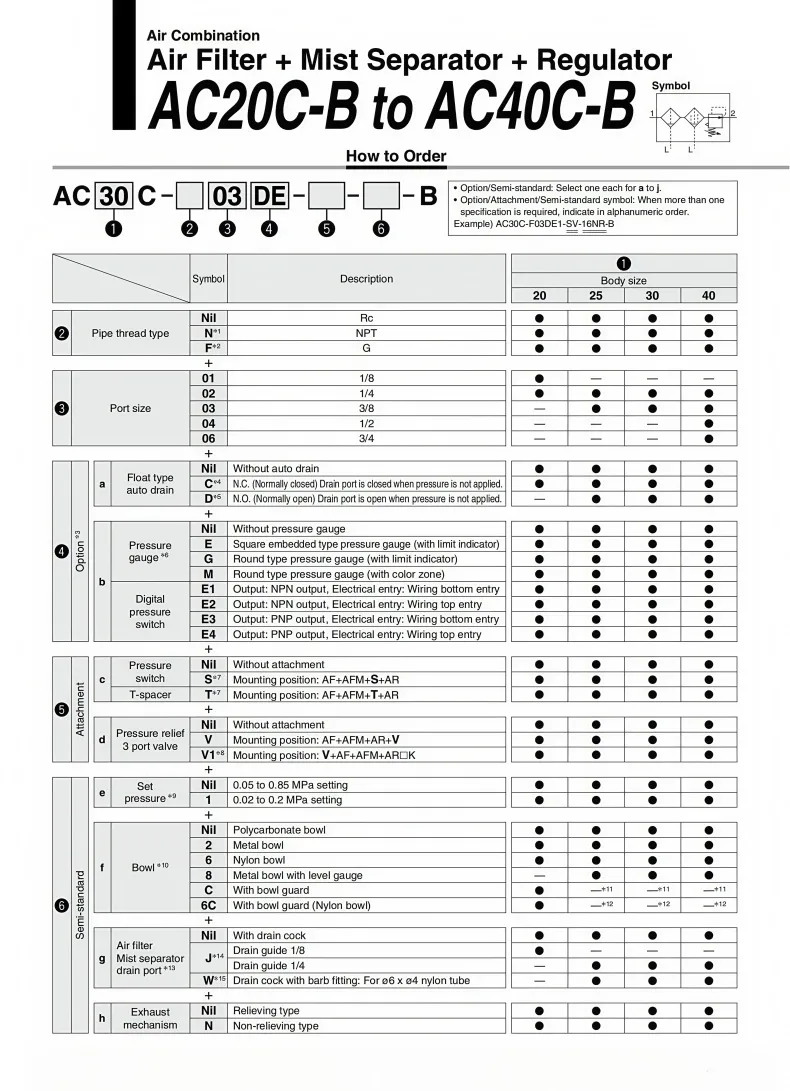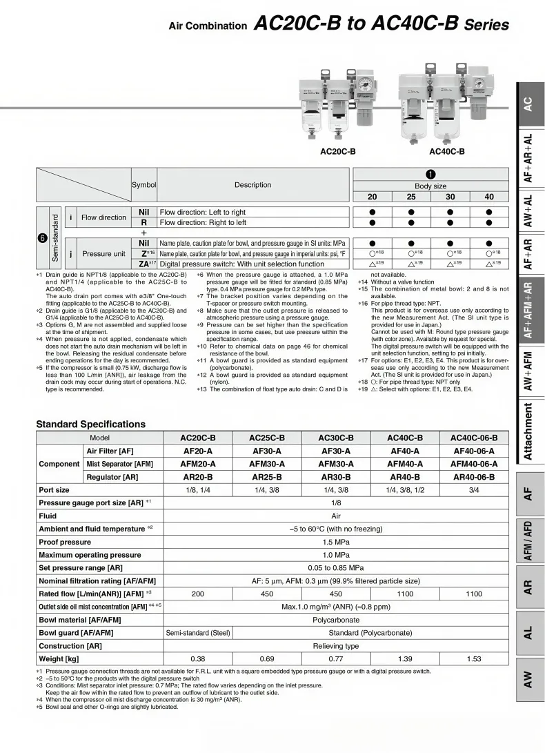AC series air combination Air Filter + Mist Separator + RegulatorComponent Function Introduction:The AF series air filters remove impurities, oil, sewage, etc. from the compressed air, and store them in the filter to achieve the purpose of making the compressed air dry and clean.The AR Series air relief regulator is used to adjust the pressure of compressed air. After adjusting to the appropriate pressure, the locking device should be locked to prevent accidental operation.The AFM series of air filters have a filtration accuracy of 0.3um, precisely removing oil, impurities and dust.