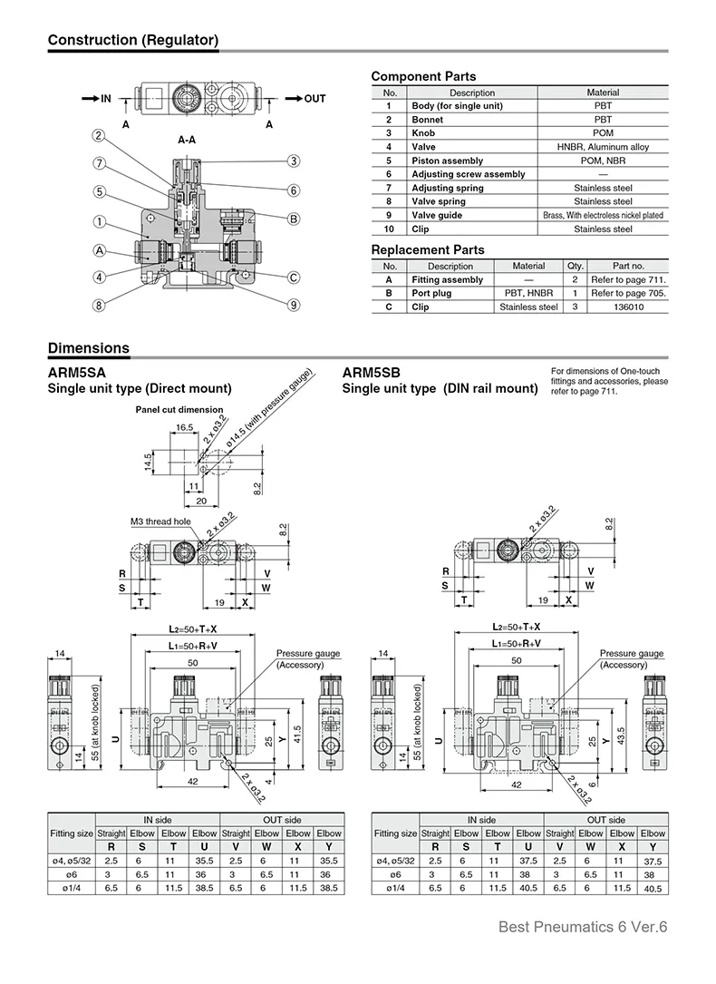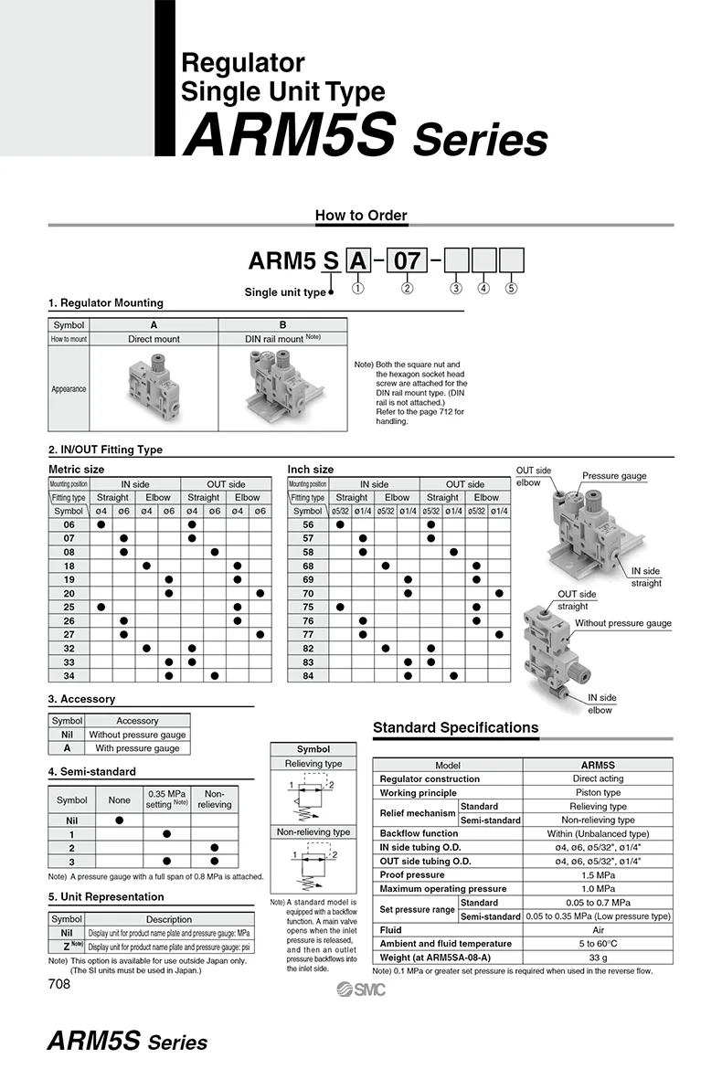 Regulator single unit type ARM5S series precision pressure regulation•precision thread•high-quality seal•high strength material•long lifespanPreferred high strength material Hard reinforced shell Integral die casting molding Corrosion resistance more robustCompact structure saves space Seal tight,non-leakage, anti-rotating designWidely used complete range of models Regulator mounting a:direct mount b:din rail mount