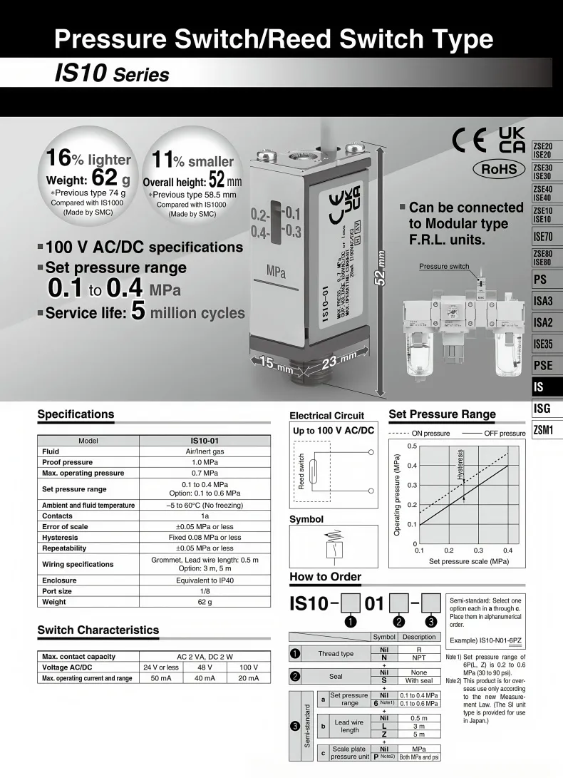 Pressure Switch/Reed Switch TypePressure display window: Precise and clear pressure measurementRotary pressure regulation: When the pressure range needs to be adjusted again, simply turn the screws on the top of the product with a screwdriver to adjust the pressure window indication range.Pressure display window: When the intake pressure exceeds the set pressure, the switch will give an alarm to alert the staff to adjust the pressure. Once the pressure returns to below the set pressure, the alarm will stop.