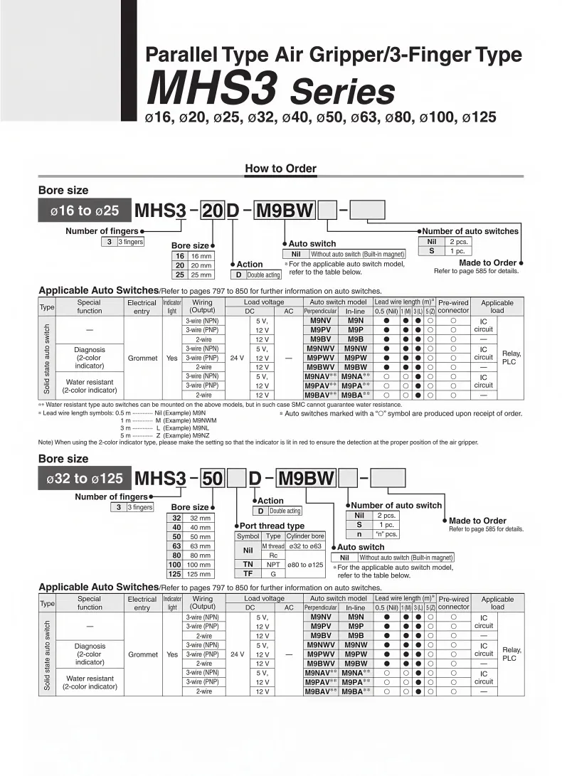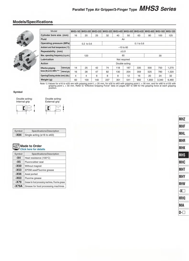 MHS3 Series Parallel Type Air Gripper/3-Finger TypeThe surface of the cylinder block is treated with hard anodizing to enhance the wear resistance and corrosion resistance of the cylinder.High-strength alloy claws. The claws are specially treated to enhance stability, increase strength, and resist rust and corrosion.High-quality copper sleeve, equipped with imported sealing ring and featuring oil storage functionCan be used in combination with magnetic switches. The extended stroke is precisely processed. The body is precisely machined by a CNC processing center. The threads are clear and the installation is convenient. The stroke is more than twice that of the standard product.The built-in magnetic ring can be combined with the magnetic switch to sensitively control the operation of the cylinder by sensing the cylinder's state.