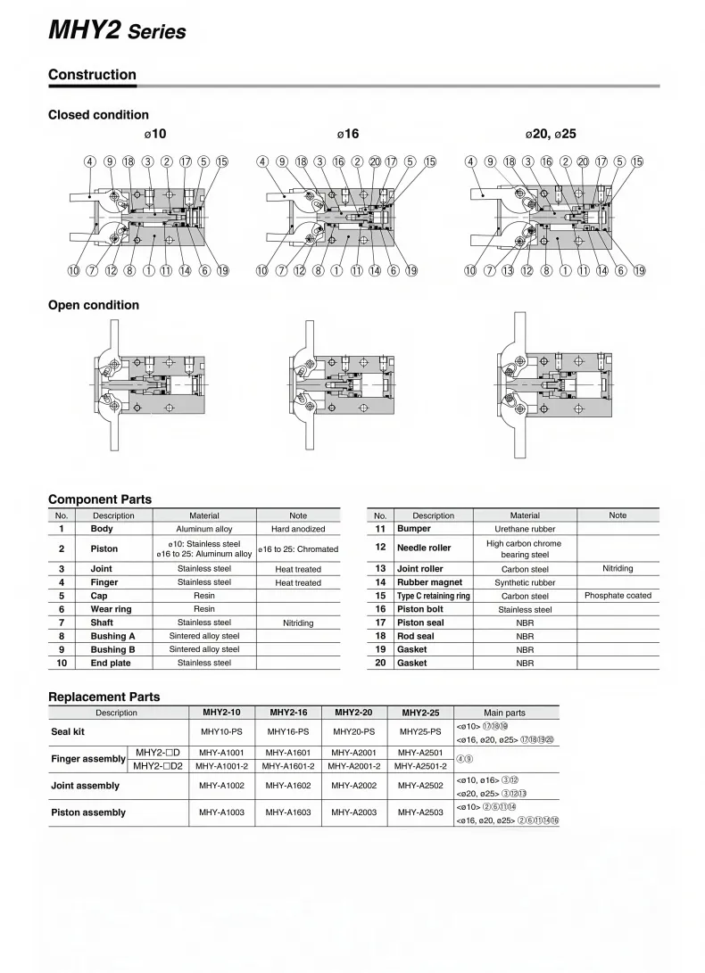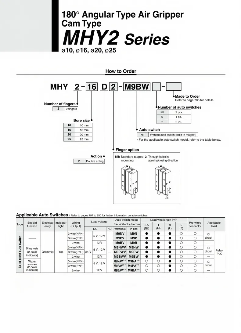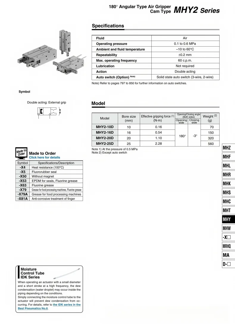 180°Angular Type Air Gripper Cam Type MHY2 SeriesStainless steel gripper with high strength and corrosion resistance. Fully hard anodized. Minor scratches will not leave any marks.High-quality spring clips imported seals. Imported self-lubricating sealing components prevent cylinder leakage; durable, wear-resistant, with small errors and high efficiency.Simplifying the picking-up and placing actions can prevent foreign objects from entering and is suitable for use in special environments.180°opening and closing。To adapt to the scenarios with limited installation space, the guide rails are equipped with two optional air intake designs for enhanced performance.Cylinder with magnetic sensitivity. Suitable for D-A93 and other magnetic switches. Detects the movement state by sensing the circular magnetic grooves. Can be directly installed.